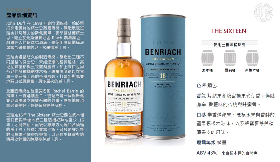 班瑞克16年能讓人更深入探究這個特性的層次。新鮮水果香調轉化為更醇美的氣息,麥芽的香甜味轉變帶有更多蜂蜜香氣,橡木辛香則成得更芬芳而平衡。